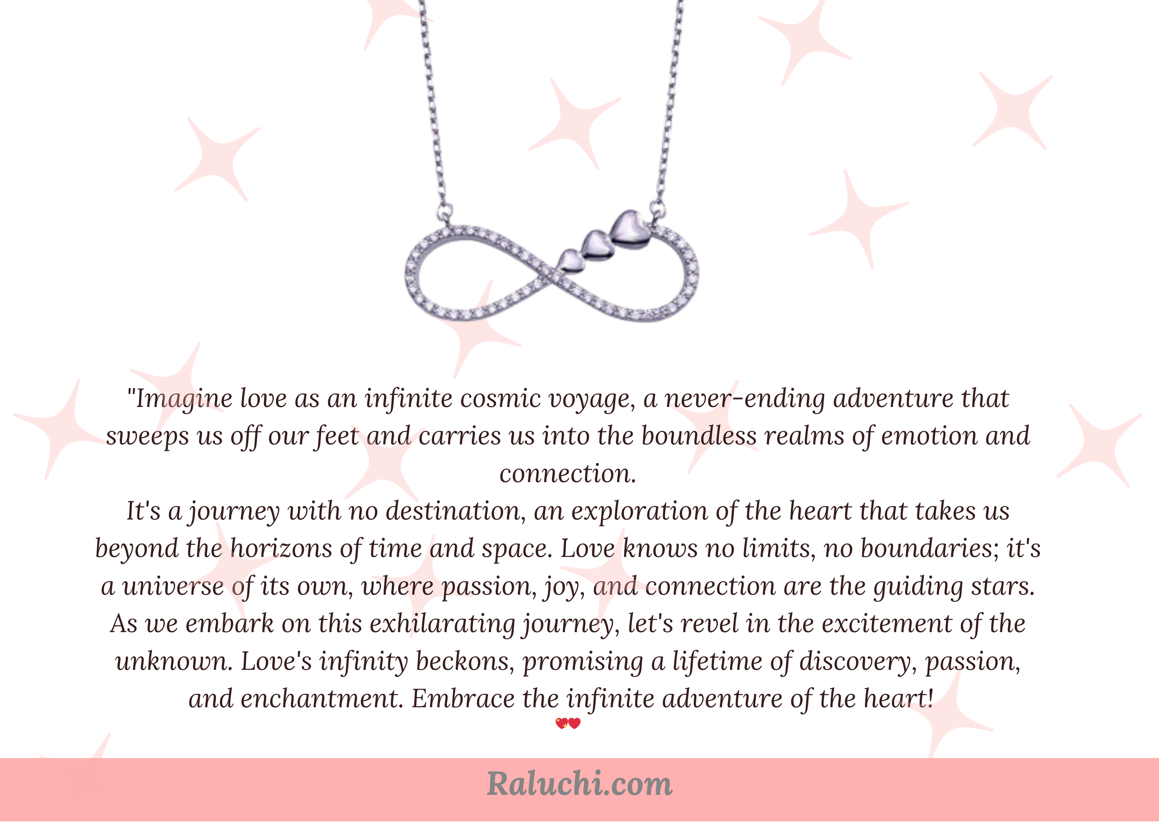 "Imagine love as an infinite cosmic voyage, a never-ending adventure that sweeps us off our feet and carries us into the boundless realms of emotion and connection. It's a journey with no destination, an exploration of the heart that takes us beyond the horizons of time and space. Love knows no limits, no boundaries; it's a universe of its own, where passion, joy, and connection are the guiding stars. As we embark on this exhilarating journey, let's revel in the excitement of the unknown. Love's infinity beckons, promising a lifetime of discovery, passion, and enchantment. Embrace the infinite adventure of the heart! 💖❤️